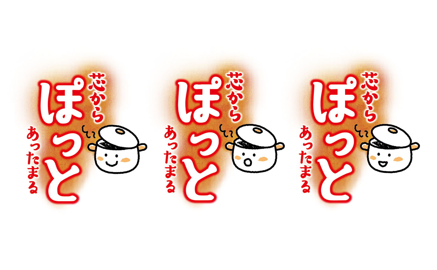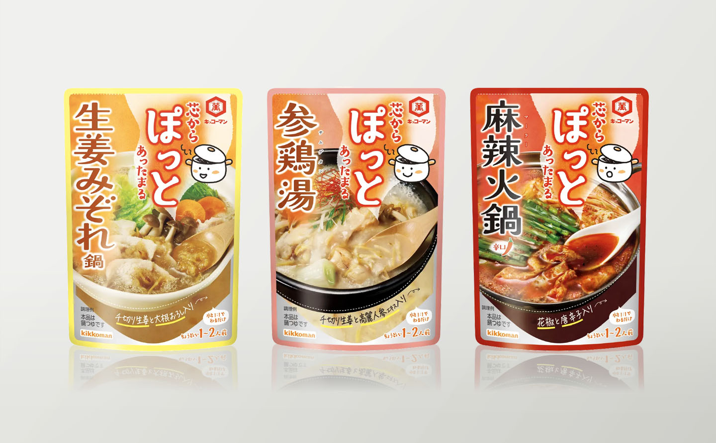 キッコーマン食品様の「芯からぽっと」シリーズ。デザインを担当させていただきました。本シリーズは、生姜・唐辛子・高麗人参といった“温素材”が具材として入っていることが特長で、体の芯からじんわり温まる感覚が長く続く鍋つゆです。1〜2人前の使いやすいサイズで、つゆと水を1:1で希釈して使用しますが、パウチ裏面に計量メモリが付いているため、パウチ自体を計量カップとして使える設計になっています。デザインだけでなくネーミング案のご提案にも携わりました。キャラクターとして「ぽっとちゃん」を制作し、3商品それぞれで異なる表情を持たせています。